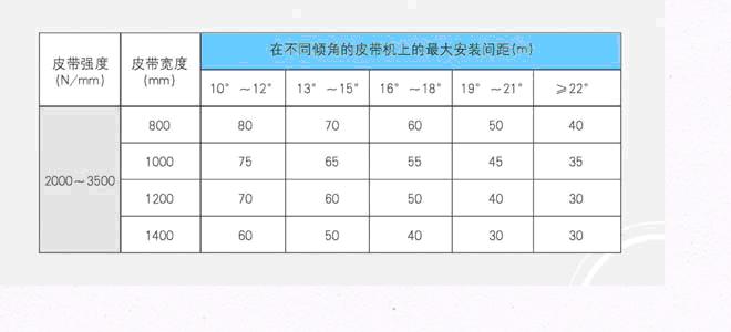 在不同傾角的皮帶機(jī)上的最大安裝間距(m)--(參考值)
